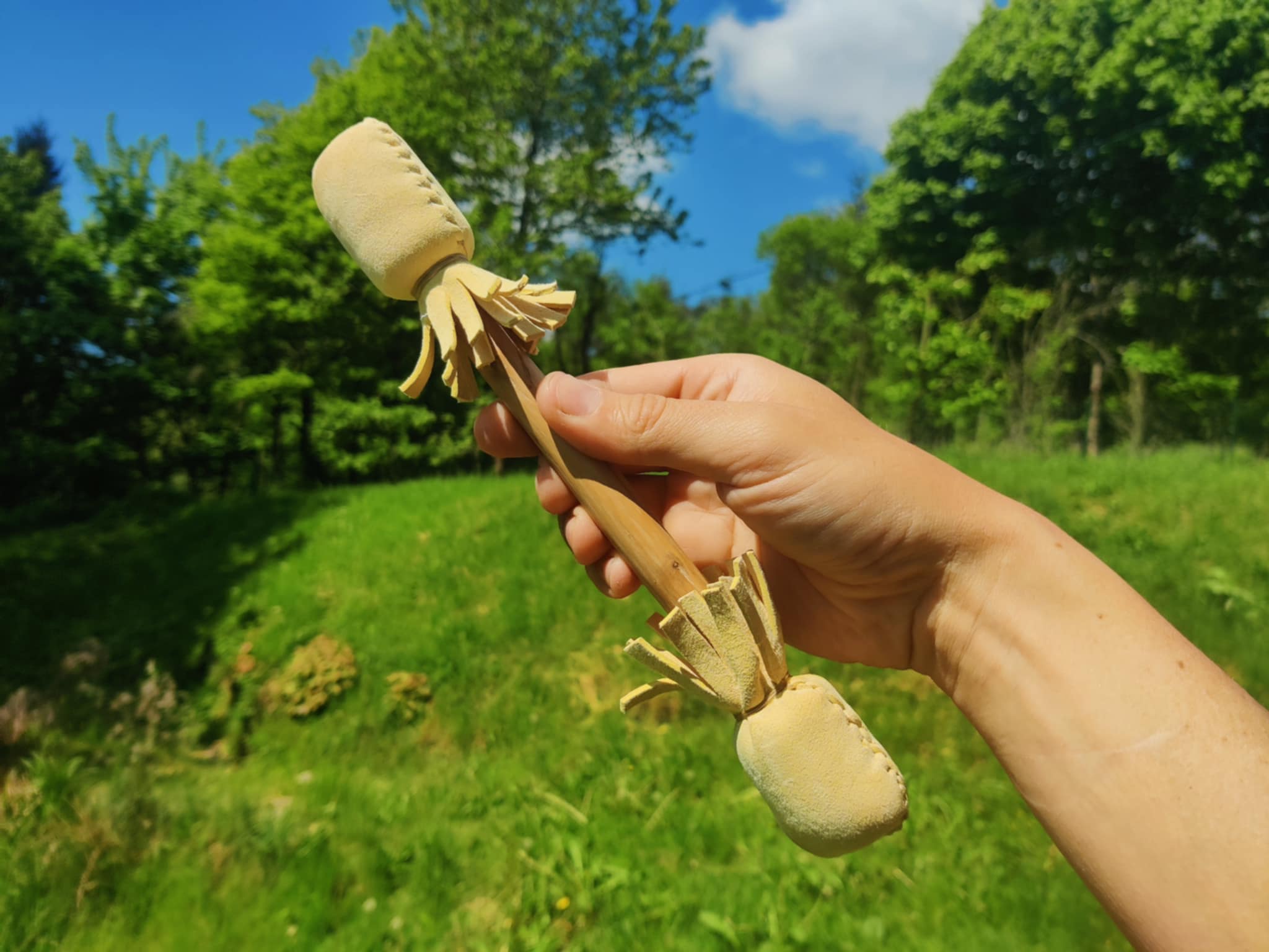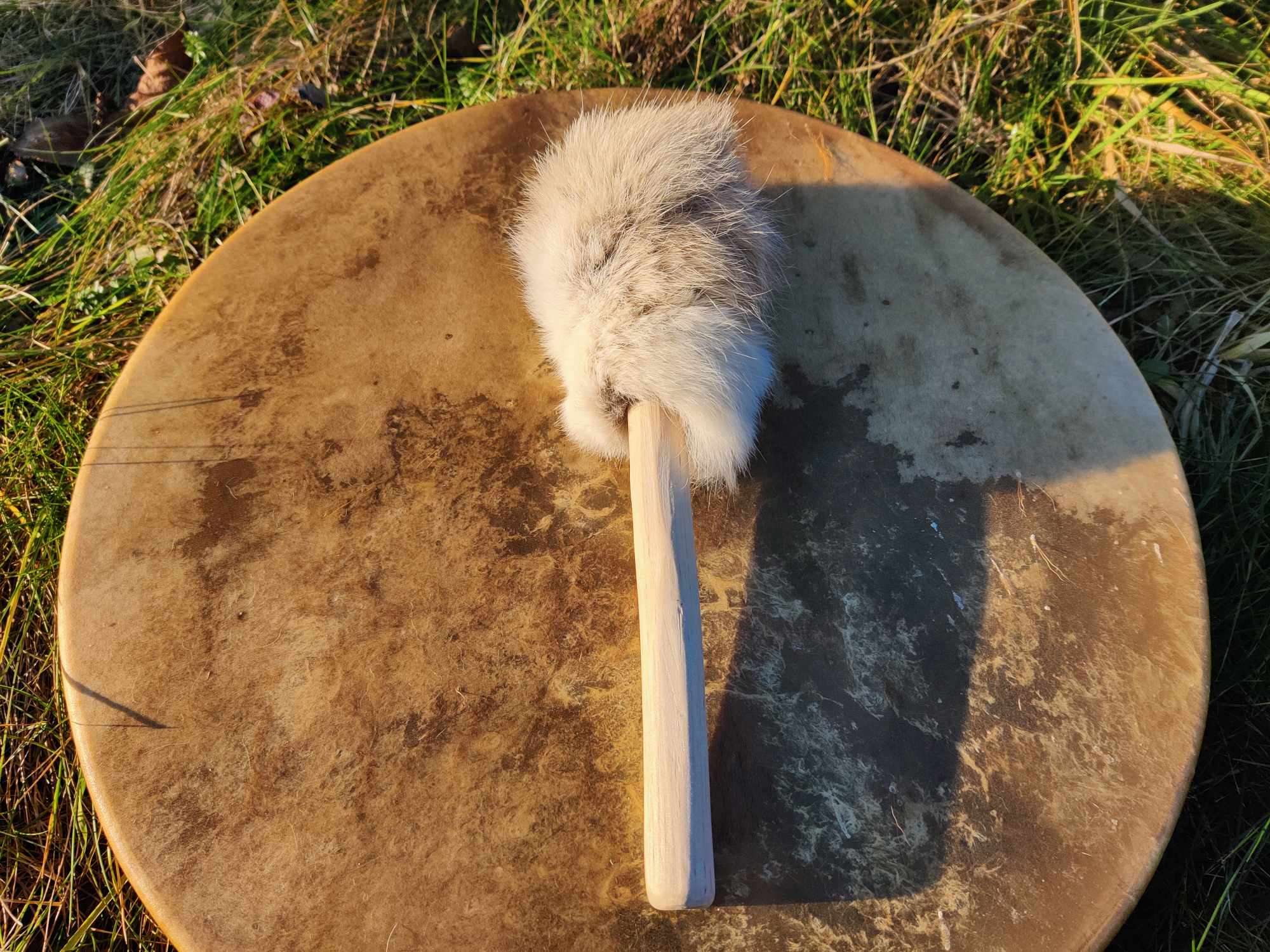 Jedinečný buben 54x25cm… z jemné kůže české srnkyS oboustrannou paličkou z větvičky černého bezu