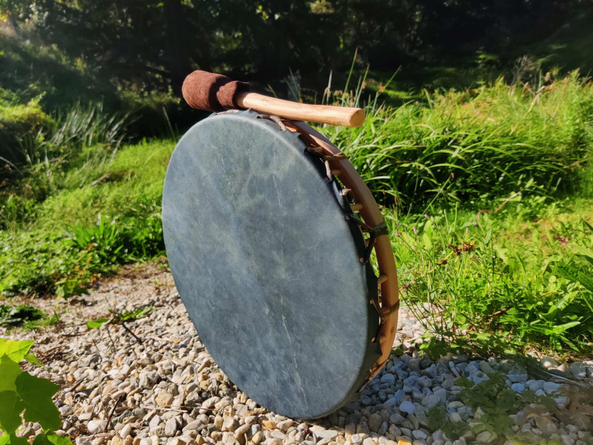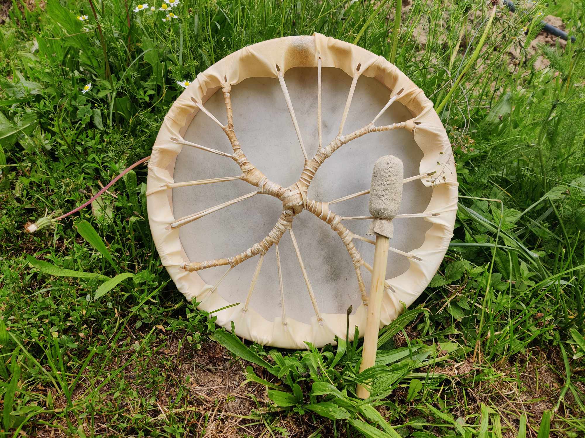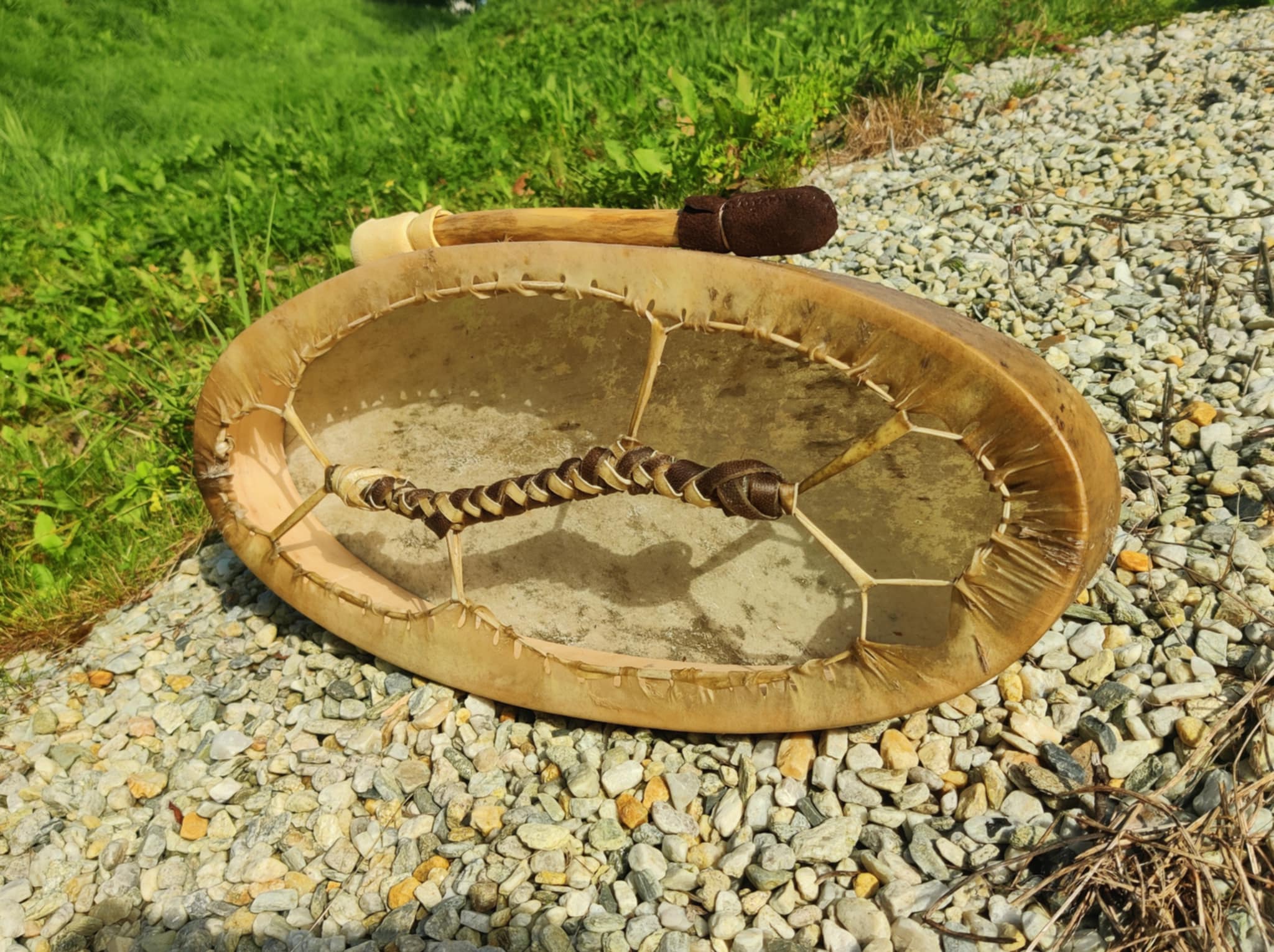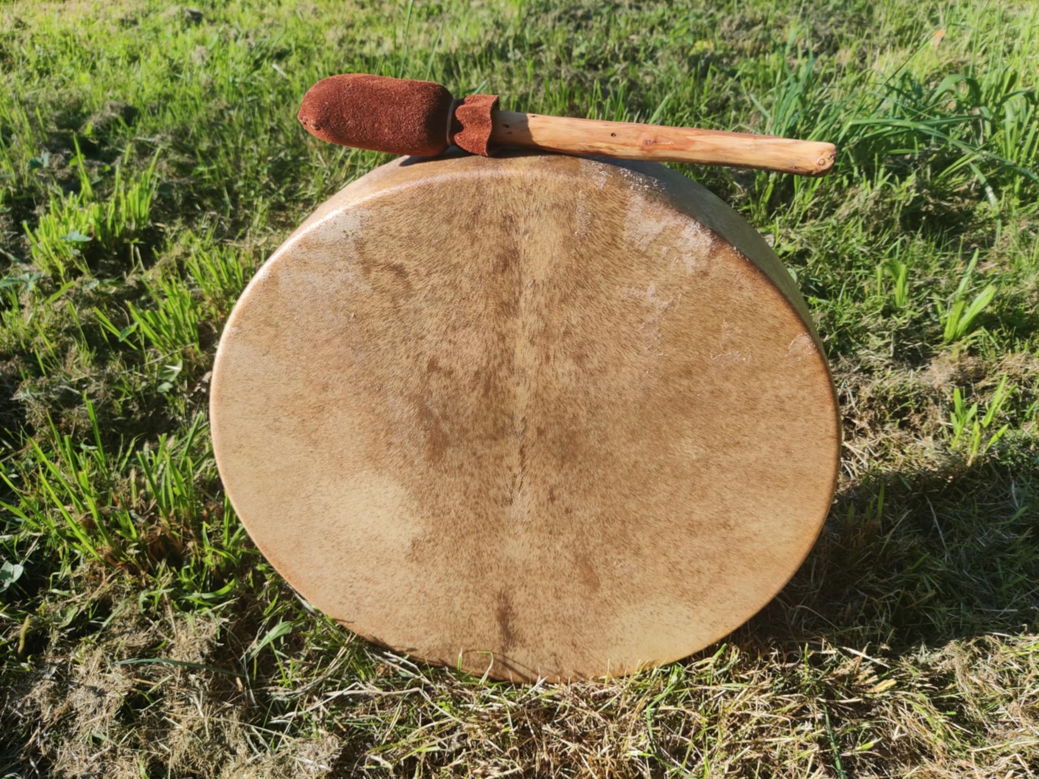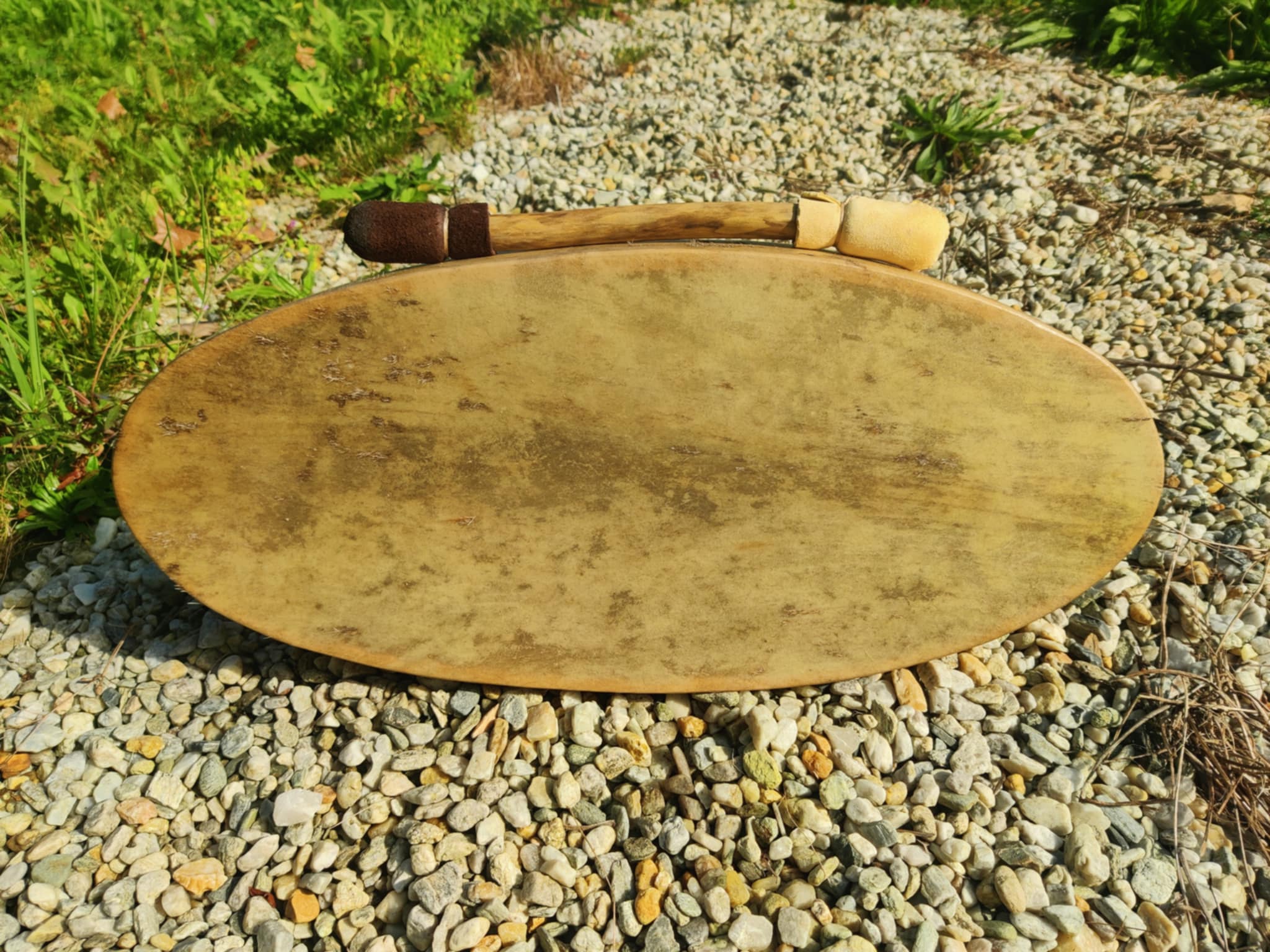 Jedinečný buben 54x25cm… z jemné kůže české srnkyS oboustrannou paličkou z větvičky černého bezu